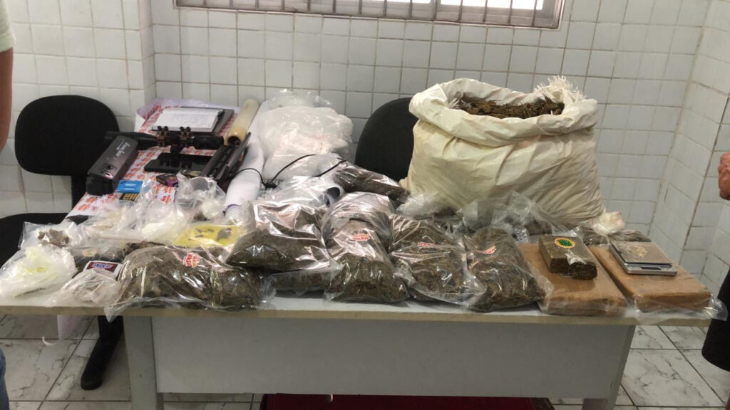 Foram apreendidos dois carregadores de rifles, 44 munições calibre 22, grande quantidade de drogas, três aparelhos celulares, embalagens para acomodações de drogas, adesivos para identificação das drogas, uma balança de precisão e um caderno de anotações do tráfico.