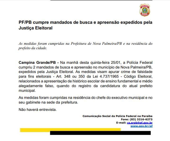 A Polícia Federal emitiu uma nota esclarecendo a operação: “Na manhã desta quinta-feira (25/01), a Polícia Federal cumpriu dois mandados de busca e apreensão no município de Nova Palmeira/PB, expedidos pela Justiça Eleitoral. As medidas visam apurar crime de falsidade para fins eleitorais – Art. 348 ou 350 da Lei 4.737/1965 – Código Eleitoral, relacionados à apresentação de histórico escolar de ensino fundamental e médio alegadamente falso, quando do registro da candidatura do atual prefeito municipal. As medidas foram cumpridas na residência do chefe do executivo municipal e em seu gabinete na sede da prefeitura.”