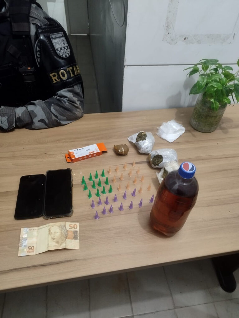 Rapidamente, foi realizada a interceptação e a abordagem da dupla, quando foram encontradas algumas porções de maconha, 39 pinos de cocaína, além de uma garrafa com bebida alcóolica e dois celulares.