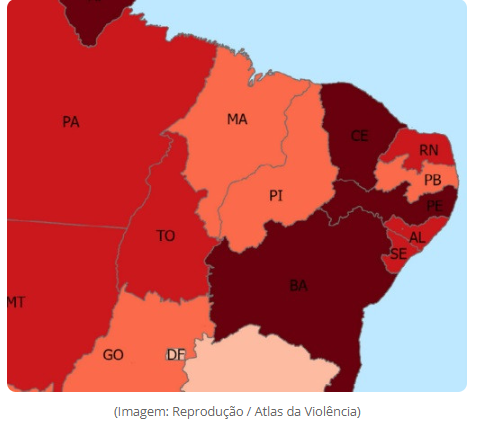 O Atlas da Violência também destaca um aumento na violência ao avançar do Sul para o Norte do país. No entanto, mesmo com uma taxa de homicídios superior à média nacional, a Paraíba mantém índices inferiores aos de todas as Unidades Federativas vizinhas, que aparecem em vermelho no mapa da violência.
