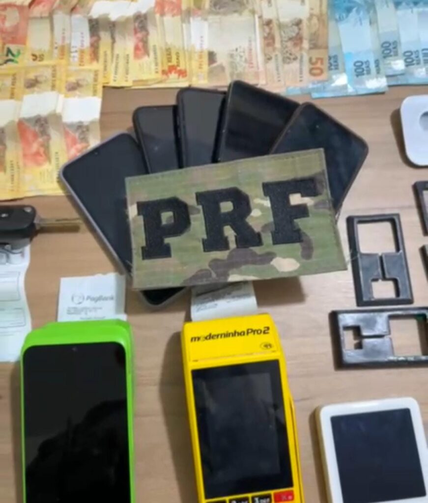 Uma revista minuciosa revelou diversos materiais usados na clonagem de cartões, incluindo quatro máquinas de cartão de crédito e débito e dez dispositivos do tipo “chupa-cabra”, comumente usados em caixas eletrônicos para copiar dados bancários. Além dos equipamentos, os policiais encontraram R$ 3.693,00 em espécie escondidos no veículo.