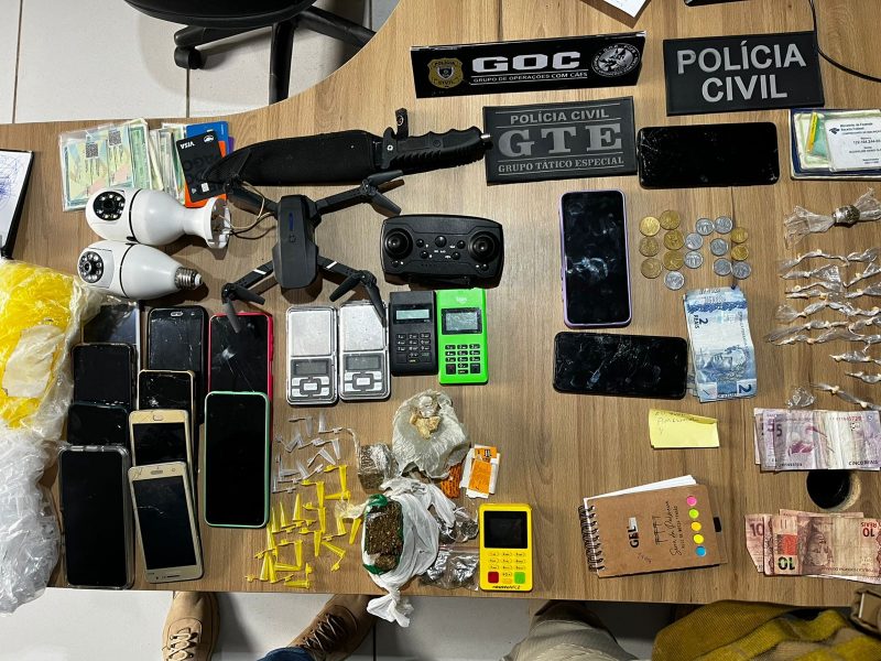 Nos imóveis, os agentes apreenderam maconha, crack, pinos com resquícios de cocaína, balanças de precisão, maquininhas de cartão, além de cadernos com anotações sobre a venda de drogas. Também foram recolhidas câmeras de vigilância, instaladas estrategicamente pelos suspeitos para monitorar o movimento ao redor dos pontos de tráfico.