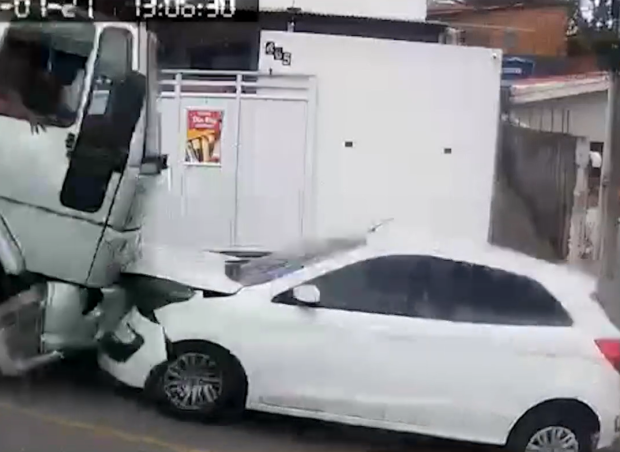Imagens de câmeras de segurança mostram o caminhão descendo uma ladeira e arrastando um carro preto, antes de colidir com a traseira de outro automóvel estacionado. Pouco antes, um carro prata também havia sido arrastado ao tentar subir a via.