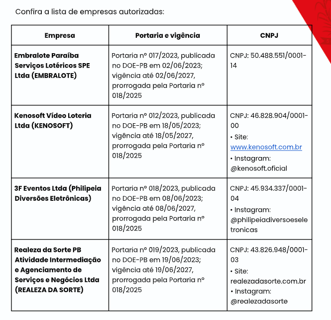 Conforme relação disponível no site oficial da Lotep (lotep.pb.gov.br), quatro empresas possuem portaria válida para operar a modalidade em todo o território estadual. Seus terminais apresentam identificação com logomarcas, informações corporativas e documentação regular, o que facilita a verificação por parte dos comerciantes e da população.