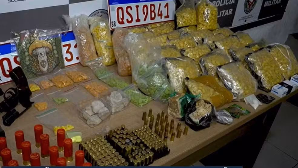 No local, foram apreendidos diversos tipos de drogas, como cocaína, LSD, ecstasy, crack e haxixe, além de um revólver calibre 38, munições de vários calibres, placas de veículos e medicamentos controlados.